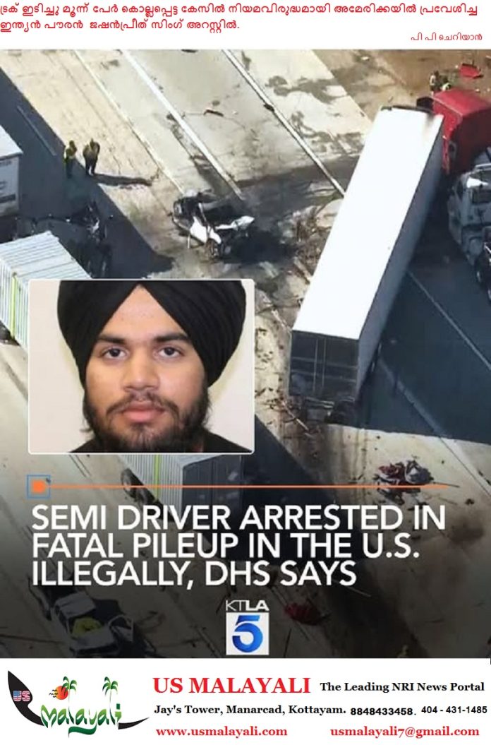 ലോസ് ഏഞ്ചൽസ്, കാലിഫോർണിയ – തിരക്കേറിയ ഗതാഗതത്തിലേക്ക് അമിതവേഗതയിൽ വന്ന ഒരു സെമി-ട്രക്ക് ഇടിച്ചുകയറി വൻ തീപിടുത്തത്തിന് കാരണമാകുകയും അതിൽ മൂന്ന് പേർ കൊല്ലപ്പെടുകയും ഡ്രൈവർ ഉൾപ്പെടെ നിരവധി പേർക്ക് പരിക്കേൽക്കുകയും ചെയ്ത സംഭവത്തിൽ 2022 ൽ നിയമവിരുദ്ധമായി അമേരിക്കയിൽ പ്രവേശിച്ച ഇന്ത്യൻ പൗരനായ 21 വയസ്സുള്ള ജഷൻപ്രീത് സിംഗ് ആണ് ഡ്രൈവറെന്ന് അധികൃതർ തിരിച്ചറിഞ്ഞു. ഒക്ടോബർ 21 ഉച്ചയ്ക്ക് ഒന്റാറിയോയിലെ I-10, I-15 ഇന്റർചേഞ്ചിന് സമീപമാണ് അപകടമുണ്ടായത്