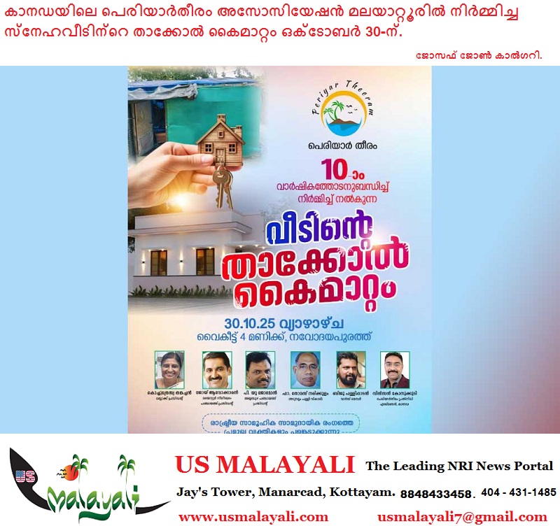 തങ്ങളുടെ പത്താം വാർഷികാഘോഷങ്ങളുടെ ഭാഗമായി, പെരിയാർ തീരം അസോസിയേഷൻ മലയാറ്റൂർ-നീലേശ്വരം പഞ്ചായത്തിലെ രണ്ടാം വാർഡിലെ ഒരു നിർദ്ധന കുടുംബത്തിന് പുതിയ വീട് നിർമ്മിച്ച് നൽകി. ഈ സ്നേഹഭവനത്തിന്റെ താക്കോൽദാനം 2025 ഒക്ടോബർ 30-ന് നടക്കും. അങ്കമാലി ബ്ലോക്ക് പഞ്ചായത്ത് പ്രസിഡന്റ് കൊച്ചുത്രേസ്യാ തങ്കച്ചൻ, മലയാറ്റൂർ-നീലേശ്വരം ഗ്രാമപഞ്ചായത്ത് പ്രസിഡന്റ് ജോയി ആവോക്കാരൻ, പെരിയാർ തീരം മുൻ പ്രസിഡണ്ട് വിൻസൺ കൊനുകുടി , മറ്റ് വിശിഷ്ട വ്യക്തികൾ താക്കോൽ ദാന ചടങ്ങിൽ പങ്കെടുക്കും.