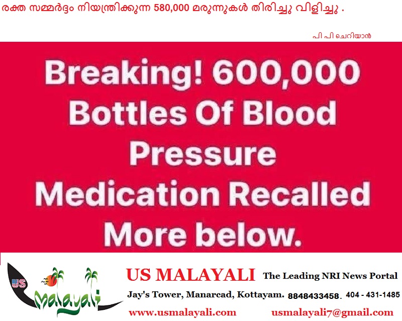 ന്യൂയോർക് :മാരകമായ ക്യാൻസർ സൃഷ്ടിക്കാൻ സാദ്ധ്യതയുള്ള രാസവസ്തു കൂടുതലായി ഉള്ളതിനാൽ 580,000-ൽ കൂടുതലായുള്ള ബ്ലഡ് പ്രഷർ മരുന്നുകൾ തിരിച്ചു വിളിച്ചു . പ്രാസോസിൻ ഹൈഡ്രോക്ലോറൈഡ് ക്യാപ്സ്യൂളുകൾ (1mg, 2mg, 5mg ഡോസ്) ഉണ്ടായിരുന്ന ‘നൈട്രോസാമിനുകൾ’ (N-nitroso Prazosin Impurity C) എന്ന രാസവസ്തു, അമിതമായ സ്രോതസ്സ് പ്രകാരം, കാലങ്ങളായി ഉപയോഗിക്കുന്നതിന്റെ ഭാഗമായി ക്യാൻസർ അത്രയും അപകടകരമായ സാധ്യത വർദ്ധിപ്പിക്കുന്നു.