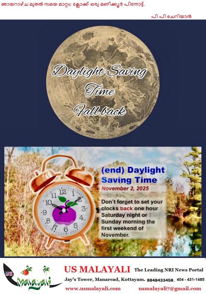 നവംബര് 2 ഞായറാഴ്ച പുലര്ച്ചെ 2 മണിക്ക് പകല് കൂടുതല് ലഭിക്കുന്നത് അവസാനിച്ച്, സമയം പുലര്ച്ചെ ഒരു മണിയിലേക്ക് മടങ്ങുന്നു.കഴിഞ്ഞ വസന്തകാലത്ത് മാര്ച്ച് 9 നായിരുന്നു പകല് കൂടുതല് സമയം ആരംഭിച്ചത്.