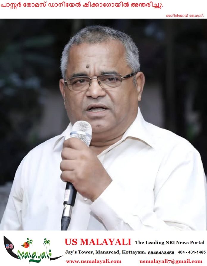 ഷിക്കാഗോ: ഇന്ത്യ പെന്തകോസ്ത് ദൈവസഭ എബനേസർ മല്ലശ്ശേരി സഭയുടെ അംഗമായിരുന്ന പാസ്റ്റർ തോമസ് ഡാനിയേൽ (70) ഷിക്കാഗോയിൽ അന്തരിച്ചു