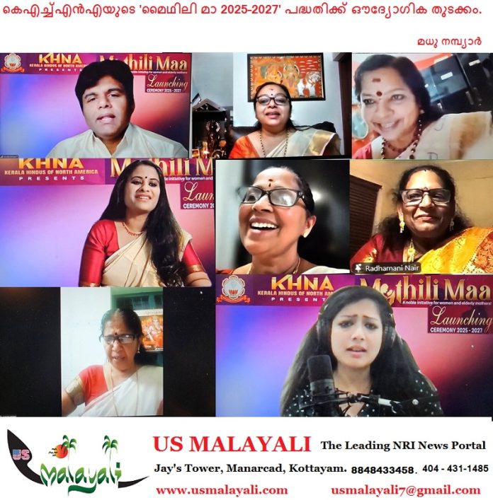 ഫ്ലോറിഡ: നവംബർ7, വെള്ളിയാഴ്ച — കേരള ഹിന്ദുസ് ഓഫ് നോർത്ത് അമേരിക്കയുടെ (KHNA)യുടെ വനിതാ സംരംഭമായ മൈഥിലി മാ 2025–2027യുടെ ഔദ്യോഗിക ഉദ്ഘാടനം സൂം മീറ്റിംഗിലൂടെ നടന്നു. വൈകുന്നേരം 7:00 PM EST-ന് ആരംഭിച്ച പരിപാടിയിൽ അമേരിക്കയിലെയും ഇന്ത്യയിലെയും അംഗങ്ങൾ പങ്കുചേർന്നു, മാതൃത്വം, ആത്മീയത, സാംസ്കാരിക ഐക്യം എന്നിവയെ ആധാരമാക്കി.