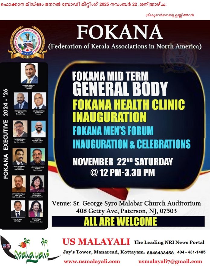 ന്യൂ യോർക്ക് : നോര്ത്ത് അമേരിക്കയിലെ മലയാളി സംഘടനകളുടെ സംഘടനയായ ഫൊക്കാനയുടെ (ഫെഡറേഷൻ ഓഫ് കേരളാ അസ്സോസിയേഷൻസ് ഇൻ നോർത്ത് അമേരിക്ക) മിഡ്ടെം ജനറല് ബോഡി മീറ്റിംഗ് 2025 നവംബർ 22 ,ശനിയാഴ്ച ഉച്ചക്ക് 12 മണി മുതൽ സെന്റ്. ജോർജ് സിറോ മലബാർ ചർച്ച് ഓഡിറ്റോറിയത്തിൽ ( 408 Getty Avenue, Paterson, NJ 07503) വെച്ച് നടത്തുന്നതാണ് എന്ന് പ്രസിഡന്റ് സജിമോൻ ആന്റണി, സെക്രട്ടറി ശ്രീകുമാർ ഉണ്ണിത്താൻ എന്നിവർ അറിയിച്ചു.