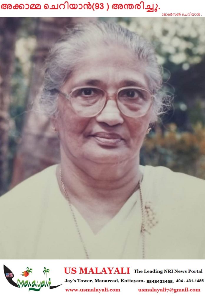 HomeKeralaഅക്കാമ്മ ചെറിയാൻ(93 ) അന്തരിച്ചു. KeralaNews അക്കാമ്മ ചെറിയാൻ(93 ) അന്തരിച്ചു. By admin November 11, 2025 0 277 Share FacebookTwitterPinterestWhatsApp ജോൺസൺ ചെറിയാൻ . യു.എസ് മലയാളിയുടെ മാനേജിങ് ഡയറക്ടർ ജോൺസൺ ചെറിയാന്റെ മാതാവ് അക്കാമ്മ ചെറിയാൻ(93 ) അന്തരിച്ചു. സംസ്കാരം വ്യഴാഴ്ച 3 മണിക്ക് മണർകാട് സെന്റ് മേരീസ് കത്തീഡ്രലിൽ. Share FacebookTwitterPinterestWhatsApp Previous articleഗ്രെഗ് ആബോട്ട് നാലാം തവണയും റീഇലക്ഷൻ പ്രചാരണം ഔദ്യോഗികമായി ആരംഭിച്ചു.Next articleകെ.എച്ച്.എൻ.എ “ശബരീ യാത്ര” – മണ്ഡല വ്രതത്തിൻ്റെ പുണ്യയാത്രക്ക് അമേരിക്കൻ മലയാളീ ഹിന്ദുക്കളുടെ സമർപ്പണം! . adminhttp://usmalayali.com RELATED ARTICLES America യു.എസ്. കുടിയേറ്റ നിയമങ്ങൾ: പുതിയ നിയന്ത്രണങ്ങളും നയപരമായ മാറ്റങ്ങളും . December 4, 2025 America ടിസാക്കിന്റെ ആഭിമുഖ്യത്തിൽ നടത്തിയ “മൈൻഡ് & മൂവ്സ് ടൂർണമെന്റ് 2025” വൈവിധ്യമാർന്ന മത്സരങ്ങൾ കൊണ്ട് ശ്രദ്ധേയമായി . December 4, 2025 America കാഷ് പട്ടേലിനെതിരെ അന്വേഷണം: ഔദ്യോഗിക വിമാനം ‘സ്വകാര്യ ഊബർ’ ആക്കി ഉപയോഗിച്ചെന്ന് ആരോപണം . December 4, 2025 LEAVE A REPLY Cancel reply Comment: Please enter your comment! Name:* Please enter your name here Email:* You have entered an incorrect email address! Please enter your email address here Website: Save my name, email, and website in this browser for the next time I comment. Most Popular യു.എസ്. കുടിയേറ്റ നിയമങ്ങൾ: പുതിയ നിയന്ത്രണങ്ങളും നയപരമായ മാറ്റങ്ങളും . December 4, 2025 ടിസാക്കിന്റെ ആഭിമുഖ്യത്തിൽ നടത്തിയ “മൈൻഡ് & മൂവ്സ് ടൂർണമെന്റ് 2025” വൈവിധ്യമാർന്ന മത്സരങ്ങൾ കൊണ്ട് ശ്രദ്ധേയമായി . December 4, 2025 കാഷ് പട്ടേലിനെതിരെ അന്വേഷണം: ഔദ്യോഗിക വിമാനം ‘സ്വകാര്യ ഊബർ’ ആക്കി ഉപയോഗിച്ചെന്ന് ആരോപണം . December 4, 2025 ആപ്പിളിന്റെ പുതിയ എ.ഐ. വൈസ് പ്രസിഡന്റായി അമർ സുബ്രമണ്യ. December 4, 2025 Load more Recent Comments