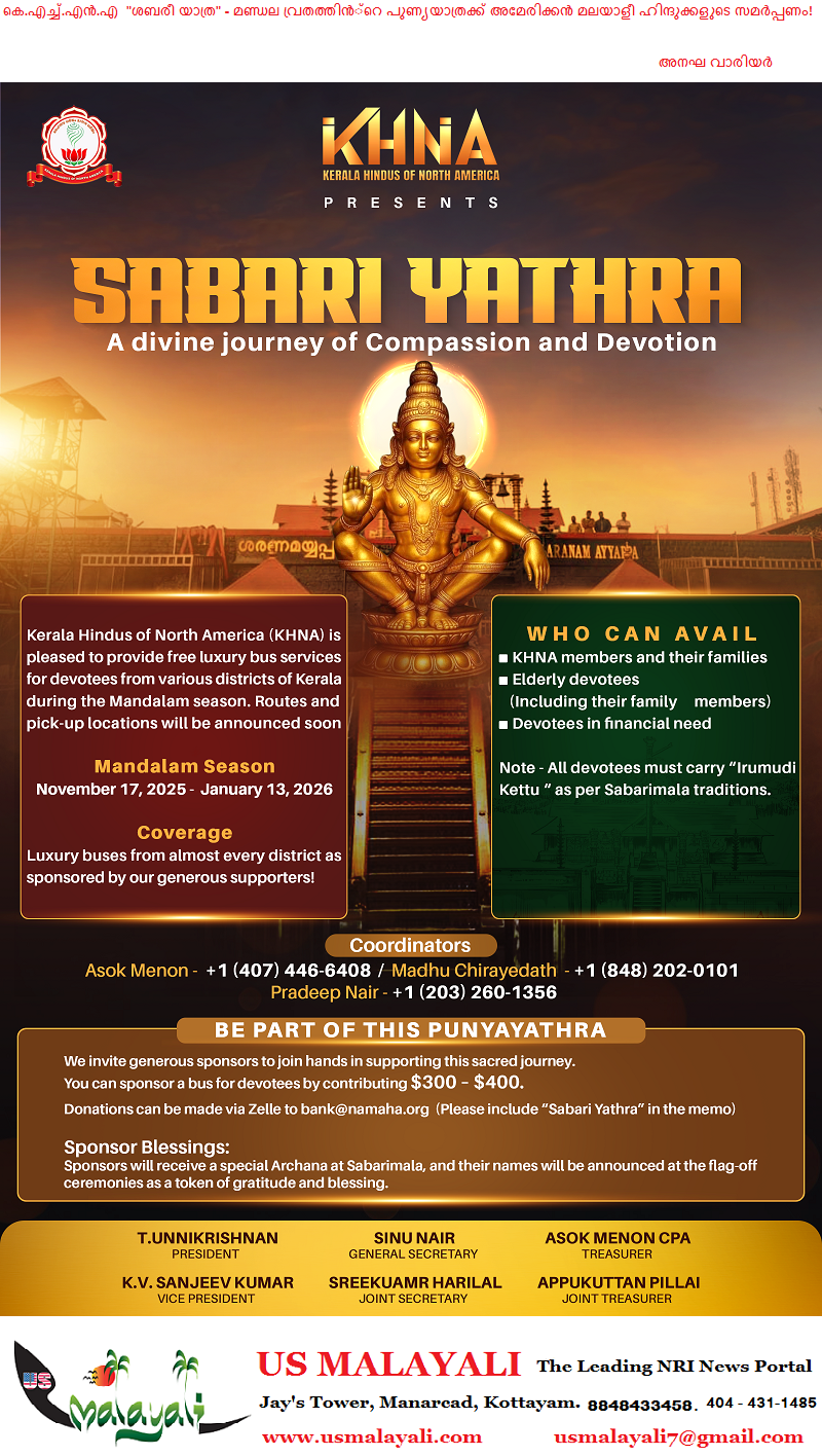 ഫ്ലോറിഡ — കേരള ഹിന്ദൂസ് ഓഫ് നോർത്ത് അമേരിക്ക (കെ.എച്ച്.എൻ.എ) മണ്ഡല കാലത്ത് കേരളത്തിലെ വിവിധ ജില്ലകളിൽ നിന്നുള്ള ഭക്തർക്കായി സൗജന്യ ബസ് സർവീസ് ഒരുക്കുന്നു. അമേരിക്കൻ മലയാളി ഹിന്ദുക്കളുടെ വിശ്വാസവും ഐക്യവും പ്രതിഫലിപ്പിക്കുന്ന ഈ “ശബരീ യാത്ര”, ഭക്തിയുടെയും സമർപ്പണത്തിൻ്റെയും പ്രതീകമായി മാറുകയാണ്.