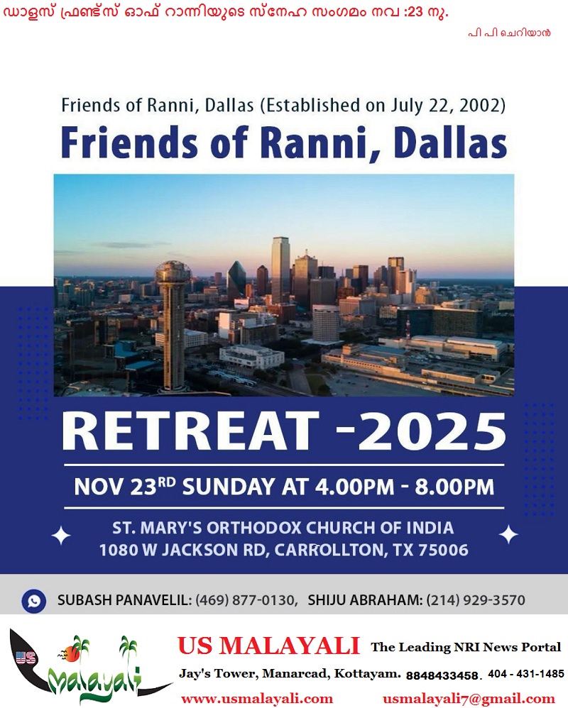 ഡാളസ് ഫ്രണ്ട്സ് ഓഫ് റാന്നിയുടെ സ്നേഹ സംഗമം നവംബർ 23-ആം തീയതി ഞായറാഴ്ച വൈകുന്നേരം 4.00 മുതൽ 8.00 വരെ കാരോൾട്ടണിൽ നടക്കും. ഈ സ്നേഹ സംഗമത്തിന്റെ ആരംഭം ഡാളസിൽ 2202 ലായിരുന്നു