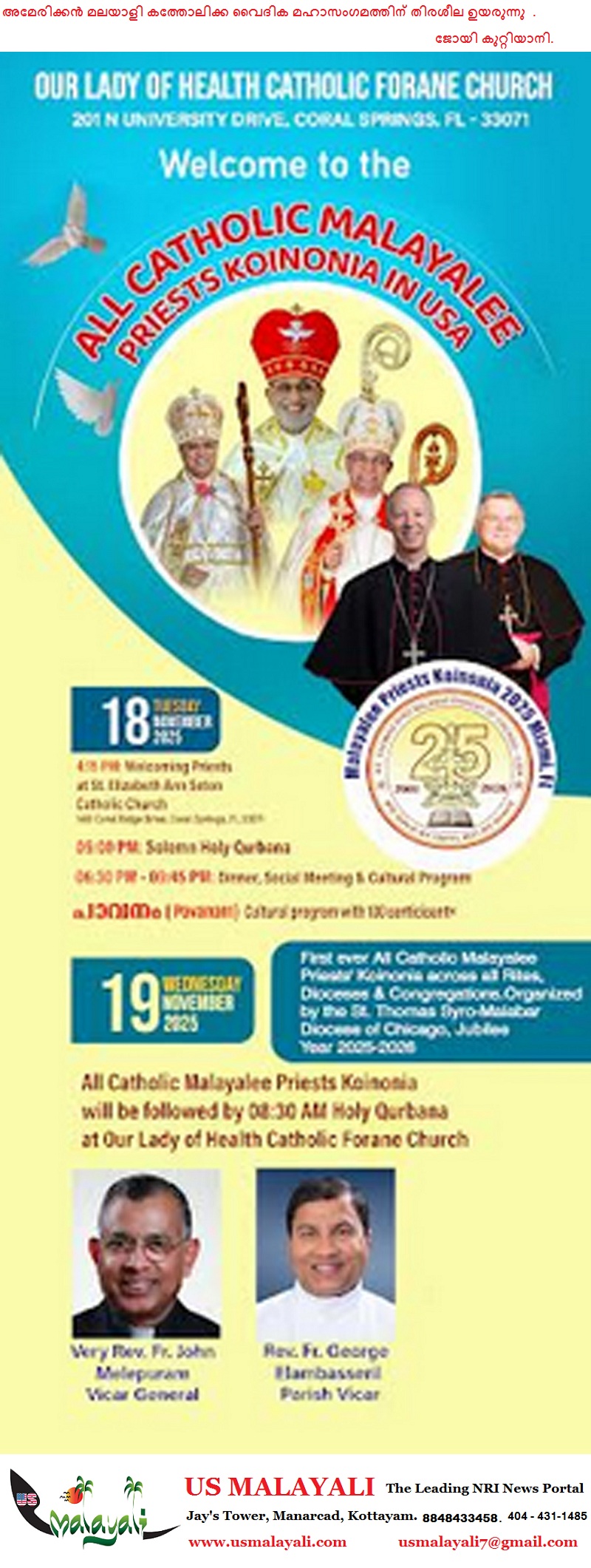 നവംബര് പതിനെട്ടാം തീയതി ചൊവ്വാഴ്ച വൈകുന്നേരം നാല്മുപ്പതിന് കോറല് സ്പ്രിങ്ങ്സിലെ സെന്റ് എലിസബത്ത് ആന് സെന്റണ് കാത്തലിക് പള്ളിയിലാണ് പരിപാടികള് നടക്കുന്നത്. (Address: St. Elizabeth Ann Senton Catholic Church 1401 Coral Ridge Drive, Coral Springs Florida-33071).