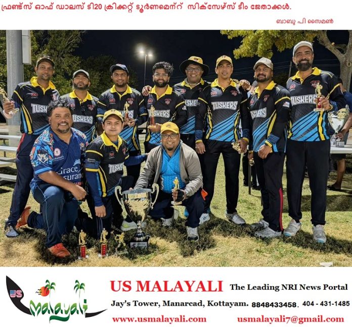 ഗാർലൻഡ്: ആവേശം അലതല്ലിയ ഫൈനലിൽ ടസ്കേഴ്സിനെ 10 വിക്കറ്റിന് തകർത്ത് സിക്സേഴ്സ് ടീം ഫ്രണ്ട്സ് ഓഫ് ഡാലസ് ടി20 ക്രിക്കറ്റ് ടൂർണമെന്റ് 2025 കിരീടം സ്വന്തമാക്കി. ഗാർലൻഡിലെ ഓഡുബോൺ ക്രിക്കറ്റ് ഗ്രൗണ്ടിൽ നവംബർ 15ന് വൈകിട്ട് 5:30ന് നടന്ന മത്സരത്തിൽ, ബാറ്റിംഗിലും ബൗളിംഗിലും ഒരുപോലെ ആധിപത്യം പുലർത്തിയാണ് സിക്സേഴ്സിന്റെ ഐതിഹാസിക വിജയം.