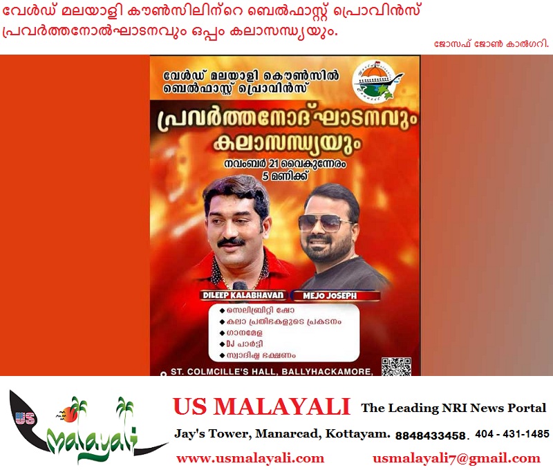 ലണ്ടൻ : വേൾഡ് മലയാളി കൗൺസിലിന്റെ (W.M.C) ബെൽഫാസ്റ്റ് പ്രൊവിൻസ് പ്രവർത്തനോൽഘാടനവും അതിനോടനുബന്ധിച്ചു കലാസന്ധ്യയും നവംബർ 21 നു വൈകുന്നേരം St. Colmcille’s Hall, Ballyhackamore, Belfast ൽ വച്ച് നടത്തപ്പെടുന്നു.