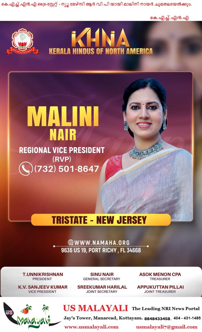 ന്യൂജേഴ്സി: കേരള ഹിന്ദൂസ് ഓഫ് നോർത്ത് അമേരിക്ക (കെ.എച്ച്.എൻ.എ) യുടെ ട്രൈ-സ്റ്റേറ്റ് – ന്യൂജേഴ്സി റീജിയണൽ വൈസ് പ്രസിഡന്റായി (RVP) പ്രശസ്ത നർത്തകിയും സാമൂഹ്യ പ്രവർത്തകയുമായ ശ്രീമതി മാലിനി നായർ ചുമതലയേൽക്കും.