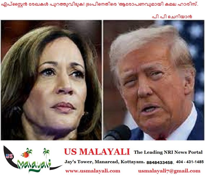 ഹാരിസ് ഈ പ്രസ്താവന നടത്തി മണിക്കൂറുകൾക്കകം, എപ്സ്റ്റൈൻ രേഖകൾ പുറത്തുവിടാൻ നീതിന്യായ വകുപ്പിന് നിർദ്ദേശം നൽകുന്ന നിയമത്തിൽ ട്രംപ് ഒപ്പുവെച്ചു.