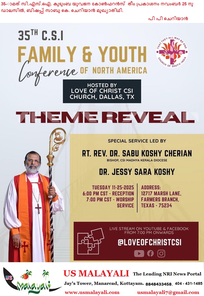 ഡാളസ്: വടക്കേ അമേരിക്കയിലെ 35-ാമത് സി.എസ്.ഐ കുടുംബ-യുവജന സമ്മേളന തീം പ്രകാശനം നവംബർ 25 നു ഡാളസ്സിൽ നടക്കും,