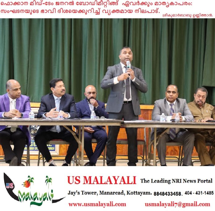 പ്രസിഡന്റ് സജിമോൻ ആന്റണിയും സെക്രട്ടറി ശ്രീകുമാർ ഉണ്ണിത്താനും, ട്രഷർ ജോയി ചക്കപ്പൻ , ട്രസ്റ്റീ ബോർഡ് ചെയർ ജോജി തോമസ് എന്നിവർ സംഘടനയുടെ പ്രവർത്തനത്തെ പറ്റി വിശദമായി സംസാരിച്ചു. കഴിഞ്ഞ ഒരു വർഷത്തെ ഫൊക്കാനയുടെ പ്രവർത്തനം വിലയിരുത്തുന്നതിന് വേണ്ടിയും സംഘടനയുടെ മുന്നോട്ടുള്ള പ്രവർത്തനങ്ങൾ ചർച്ച ചെയ്യുന്നതിനും വേണ്ടിയാണ് മിഡ് ടെം ജനറൽ ബോഡി വിളിച്ചതെന്ന് പ്രസിഡന്റ് സജിമോൻ അറിയിച്ചു.
