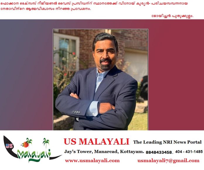 ടെക്സസ് റീജിയണിൽ ഫൊക്കാനയുടെ തിരഞ്ഞെടുപ്പ് ചർച്ചകൾ ചൂടുപിടിക്കുകയാണ്. ലീല മാരേട്ട് നയിക്കുന്ന പാനലിന് കീഴിൽ റീജിയണൽ വൈസ് പ്രസിഡന്റ് സ്ഥാനത്തേക്ക് മത്സരിക്കുന്നതായി വിനോയ് കുര്യൻ ഔദ്യോഗികമായി പ്രഖ്യാപിച്ചതോടെ മലയാളി സമൂഹത്തിന്റെ ശ്രദ്ധ മുഴുവൻ ഹൂസ്റ്റണിലേക്കാണ്. കേരളത്തിന്റെയും അമേരിക്കയുടെയും സാമൂഹിക-സാംസ്കാരിക മണ്ഡലങ്ങളിൽ ദീർഘകാല പ്രവർത്തനപരിചയമുള്ള, ആത്മാർത്ഥതയും നേതൃപാടവവും ഒത്തുചേർന്ന വ്യക്തിത്വമാണ് വിനോയ്.