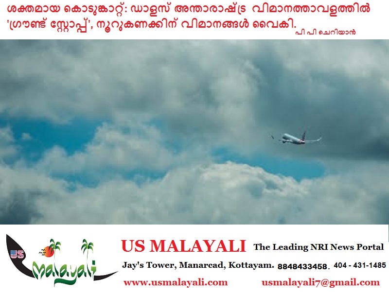 ഡാലസ്-ഫോർട്ട് വർത്ത്:: ശക്തമായ ഇടിമിന്നലിനെ തുടർന്ന് DFW അന്താരാഷ്ട്ര വിമാനത്താവളത്തിലേക്കുള്ള വിമാനങ്ങൾക്ക് ഫെഡറൽ ഏവിയേഷൻ അഡ്മിനിസ്ട്രേഷൻ (FAA) ശനിയാഴ്ച ഉച്ചയ്ക്ക് ശേഷം ‘ഗ്രൗണ്ട് സ്റ്റോപ്പ്’ പ്രഖ്യാപിച്ചു. ഇതേത്തുടർന്ന് നൂറുകണക്കിന് വിമാനങ്ങളുടെ സർവീസുകളെ ബാധിച്ചു.