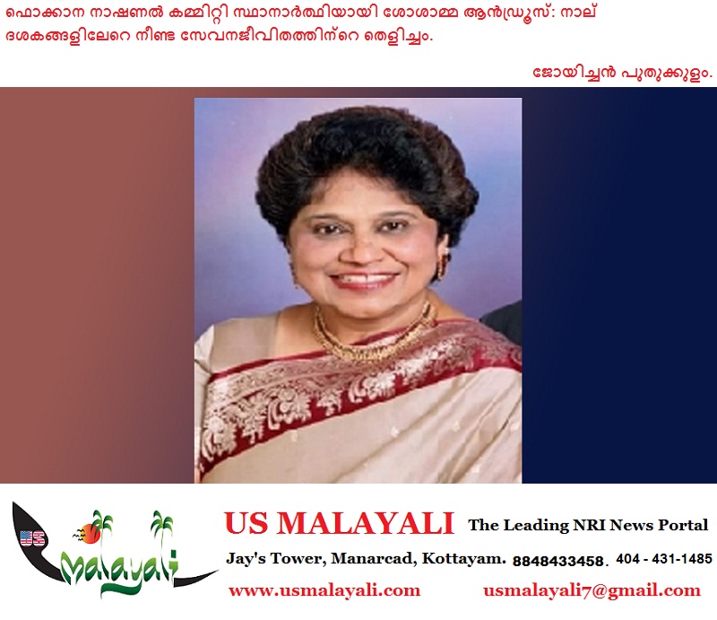 നഴ്സിംഗ് മേഖലയിലെ വിലയേറിയ സംഭാവനകളുടെ പേരിലും മലയാളി സംഘടനകളിലെ സ്ഥിര സാന്നിധ്യം എന്ന നിലയ്ക്കും സമൂഹസേവനത്തിലൂടെയുമാണ് ശോശാമ്മ ആൻഡ്രൂസ് അമേരിക്കൻ മലയാളി സമൂഹത്തിന് സുപരിചതയായി തീർന്നത്. അടുത്ത ടേമിലെ ഫൊക്കാന നാഷണൽ കമ്മിറ്റി സ്ഥാനാർഥിയായി രംഗത്തെത്തുന്ന ശോശാമ്മ, തന്റെ സമ്പന്നമായ അനുഭവവും പ്രവർത്തനപാരമ്പര്യവും കൊണ്ട് ശ്രദ്ധേയയാണ്. 1974-ൽ അമേരിക്കയിലെത്തിയ ശോശാമ്മയുടെ ജീവിതം നിഷ്ഠയുടെയും അധ്വാനത്തിന്റെയും കഥയാണ്. റാന്നി സെന്റ് തോമസ് ഹൈസ്കൂളിൽ നിന്ന് എസ്എസ്എൽസിയും മൗലാനാ ആസാദ് മെഡിക്കൽ കോളേജിൽ നിന്ന് ജനറൽ നഴ്സിംഗും മിഡ്വൈഫറിയിൽ ഡിപ്ലോമയും പൂർത്തിയാക്കിയ ശേഷം ഇർവിൻ/ജി.ബി. പന്ത് ഹോസ്പിറ്റൽ ( ന്യൂഡൽഹി) എന്നിവിടങ്ങളിൽ നഴ്സായി സേവനത്തിന്റെ പുതു അധ്യായം തുറന്നു. ബ്രൂക്ക്ലിനിലെ സെന്റ് ജോസഫ് കോളേജിൽ നിന്ന് ഹെൽത്ത് അഡ്മിനിസ്ട്രേഷനിൽ ബിരുദം നേടിയതിനെത്തുടർന്ന് 1975 മുതൽ 1990 വരെ ന്യൂ ഹൈഡ് പാർക്കിലെ പാർക്കർ ജ്യൂയിഷ് ആശുപത്രിയിൽ ഹെഡ് നഴ്സായി പ്രവർത്തിച്ചു. പിന്നീട് ക്വീൻസ് വില്ലേജിലെ ക്രീഡ്മോർ സൈക്യാട്രിക് സെൻററിൽ സ്റ്റാഫ് നഴ്സായി തുടങ്ങി നഴ്സ് അഡ്മിനിസ്ട്രേറ്റർ പദവിവരെ ഉയർന്ന് 2010-ൽ വിരമിച്ചു.