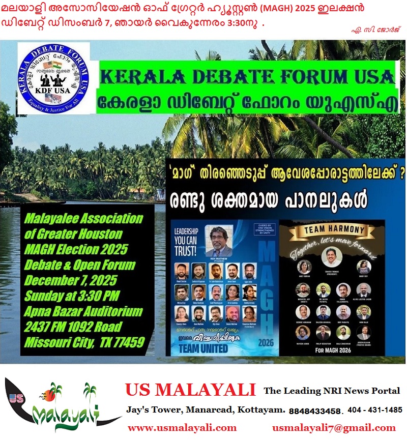ഇലക്ഷൻ നോമിനേഷനുകൾ അവസാന നിമിഷം പിൻവലിക്കുന്ന തീയതി കഴിഞ്ഞപ്പോൾ കിട്ടിയ വിവരമനുസരിച്ച് രണ്ട് ശക്തമായ പാനലുകൾ ആണ് ഇപ്രാവശ്യത്തെ മാഗ് ഇലക്ഷൻ ഗോദയിൽ കൊമ്പ് കോർക്കുന്നത്. ചാക്കോ തോമസ് നേതൃത്വം കൊടുക്കുന്ന ടീം ഹാർമണി, റോയി മാത്യു നേതൃത്വം കൊടുക്കുന്ന ടീം യുണൈറ്റഡ് എന്നിവയാണവ. രണ്ടു പാനലുകാരും വിജയം ലക്ഷ്യമാക്കി തീപാറുന്ന പ്രചരണ തിരക്കിലാണ്. ഇവിടത്തെ സംഘടനാ ഇലക്ഷൻ നിരീക്ഷകർ പറയുന്നത് ഇപ്പോൾ രണ്ടു പാനലുകാരും ഒപ്പത്തിനൊപ്പം ആണെന്നാണ്.. ഈ അവസരത്തിൽ പതിവുപോലെ ഒരു സ്വതന്ത്രവേദിയായ കേരള ഡിബേറ്റ് ഫോറം യുഎസ്എ.യുടെ ആഭിമുഖ്യത്തിൽ സ്ഥാനാർത്ഥികളെയും മറ്റു താല്പര്യമുള്ള എല്ലാ വ്യക്തികളെയും ഉൾപ്പെടുത്തി ഒരു സ്വതന്ത്ര നിഷ്പക്ഷ സൗഹാർദ്ദ സംവാദവും ഓപ്പൺ ഫോറവും സംഘടിപ്പിക്കുകയാണ്. ഡിസംബർ 7, ഞായർ വൈകുന്നേരം 3:30നു (CENTRAL TIME). ഹൂസ്റ്റണിലെ മിസോറി സിറ്റിയിലുള്ള അപ്പനാ ബസാർ ഓഡിറ്റോറിയം (2437 FM 1092 Road, Missouri City TX 77459) വച്ചാണ് പരിപാടി