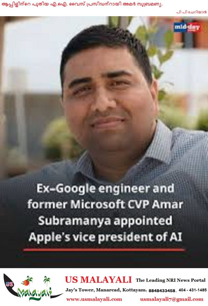 കാലിഫോർണിയ:ആർട്ടിഫിഷ്യൽ ഇന്റലിജൻസ് (AI) രംഗത്തെ പ്രമുഖനും ഇന്ത്യൻ വംശജനുമായ അമർ സുബ്രമണ്യയെ ആപ്പിളിന്റെ (Apple) പുതിയ വൈസ് പ്രസിഡന്റായി നിയമിച്ചു. എ.ഐ. രംഗത്തെ നേതൃത്വം ശക്തിപ്പെടുത്താനുള്ള ആപ്പിളിന്റെ ശക്തമായ നീക്കമായാണ് ഈ നിയമനം വിലയിരുത്തപ്പെടുന്നത്.