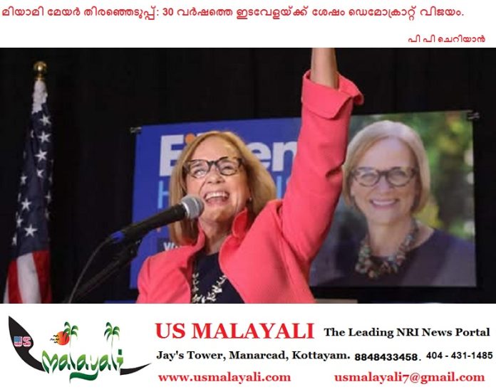 ഫ്ലോറിഡ :ചൊവ്വാഴ്ച നടന്ന മയാമി-ഡേഡ് കൗണ്ടി മേയർ റൺഓഫ് തിരഞ്ഞെടുപ്പിൽ മുൻ മിയാമി-ഡേഡ് കൗണ്ടി കമ്മീഷണർ എലീൻ ഹിഗ്ഗിൻസ് വിജയിച്ചു, ഇതോടെ, 30 വർഷത്തിലധികമായി മിയാമി നഗരത്തിൽ ഒരു ഡെമോക്രാറ്റ് മേയറായി തിരഞ്ഞെടുക്കപ്പെടുന്നത് ഇതാദ്യമാണ്.