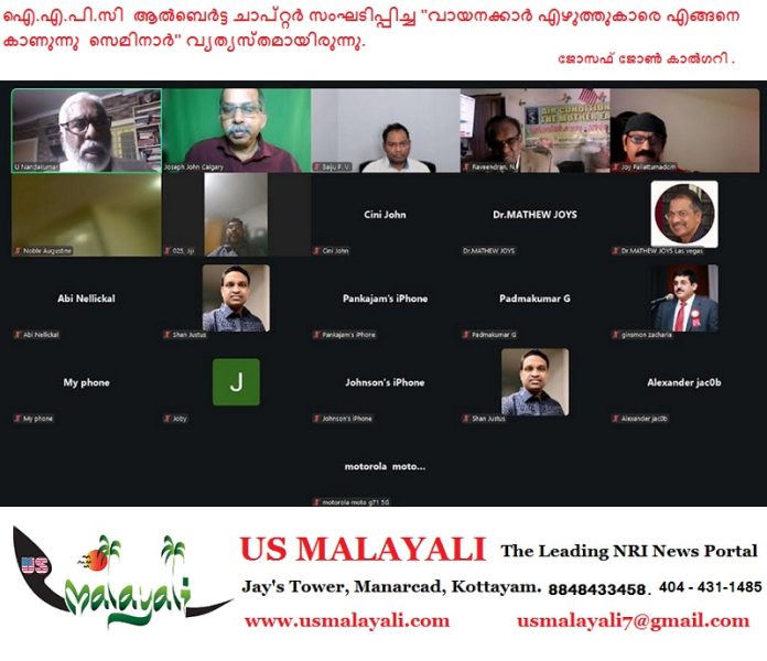 കാൽഗറി: ഇൻഡോ അമേരിക്കൻ പ്രസ് ക്ലബ് (I A P C ) ആൽബെർട്ട ചാപ്റ്റർ സംഘടിപ്പിച്ച വായനക്കാർ എഴുത്തുകാരെ എങ്ങനെ കാണുന്നു (How Readers See Writers ) എന്ന സെമിനാർ പ്രൊഫ. ഡോ. യു. നന്ദകുമാർ നയിച്ചു .