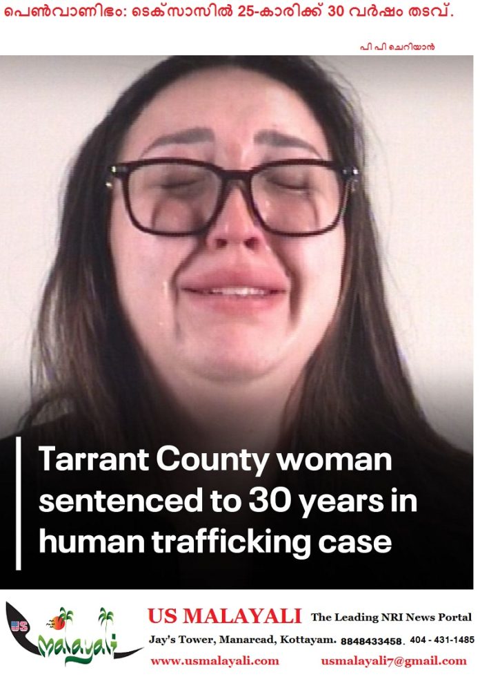 ടാരന്റ് കൗണ്ടി (ടെക്സാസ്): മനുഷ്യക്കടത്ത്, പെൺവാണിഭം എന്നീ കുറ്റങ്ങൾ ചുമത്തപ്പെട്ട 25 വയസ്സുകാരി എമിലി ഹച്ചിൻസിനെ കോടതി 30 വർഷം തടവിന് ശിക്ഷിച്ചു. ടാരന്റ് കൗണ്ടി ജില്ലാ അറ്റോർണി ഓഫീസാണ് ശിക്ഷാവിധി പുറപ്പെടുവിച്ചത്.