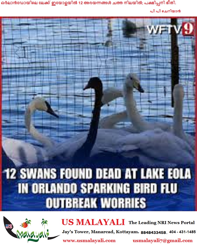 ഒർലാൻഡോ:അമേരിക്കയിലെ ഒർലാൻഡോയിലുള്ള ലേക്ക് ഇയോള പാർക്കിൽ കഴിഞ്ഞ അഞ്ച് ദിവസത്തിനിടെ 12 അരയന്നങ്ങളെ ചത്ത നിലയിൽ കണ്ടെത്തി. ഇതോടെ പ്രദേശത്ത് പക്ഷിപ്പനി (Bird Flu) പടരുന്നുണ്ടോ എന്ന ആശങ്ക ശക്തമായിരിക്കുകയാണ്.