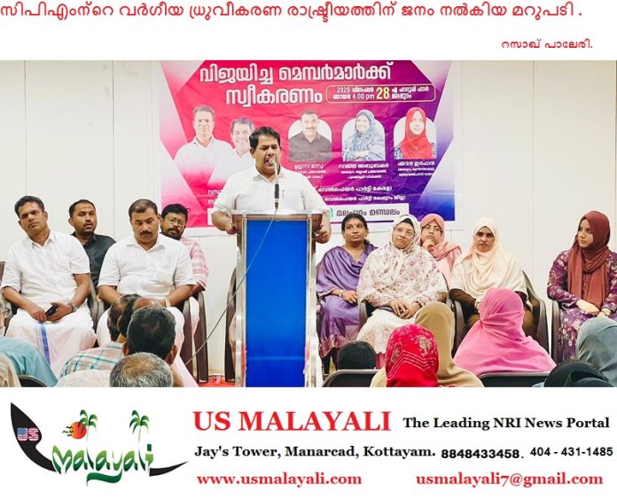 മലപ്പുറം: വെൽഫെയർ പാർട്ടിയെ മുൻനിർത്തി ഇടതുപക്ഷവും വിശിഷ്യാ സിപിഎംഉം നടത്തിയ വർഗീയ ധ്രുവീകരണ രാഷ്ട്രീയത്തിന് ജനം നൽകിയ മറുപടിയാണ് വെൽഫെയർ പാർട്ടി സ്ഥാനാർത്ഥികളുടെ വിജയമെന്ന് വെൽഫെയർ പാർട്ടി സംസ്ഥാന പ്രസിഡന്റ് റസാഖ് പാലേരി. തദ്ദേശ തെരഞ്ഞെടുപ്പിൽ മത്സരിച്ച് വിജയിച്ച വെൽഫെയർ പാർട്ടി ജനപ്രതിനിധികൾക്ക് മലപ്പുറം മണ്ഡലം കമ്മിറ്റി നൽകിയ സ്വീകരണ സമ്മേളനം ഉദ്ഘാടനം ചെയ്ത് സംസാരിക്കുകയായിരുന്നു അദ്ദേഹം.