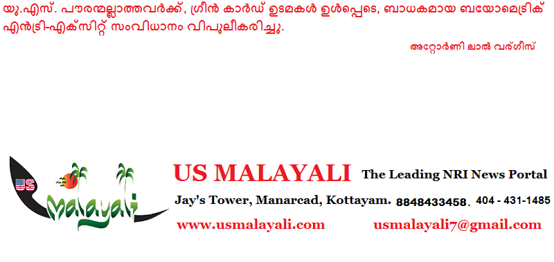 ഡാളസ് ഡിസംബർ 26 മുതൽ പ്രാബല്യത്തിൽ വന്ന പുതിയ കുടിയേറ്റ യാത്രാ നിയമത്തിന്റെ ഭാഗമായി, യു.എസ്. ആഭ്യന്തര സുരക്ഷാ വകുപ്പ് (DHS) യു.എസ്. പൗരന്മല്ലാത്തവർക്ക്, ഗ്രീൻ കാർഡ് ഉടമകൾ ഉൾപ്പെടെ, ബാധകമായ ബയോമെട്രിക് എൻട്രി–എക്സിറ്റ് സംവിധാനം വിപുലീകരിച്ചു.