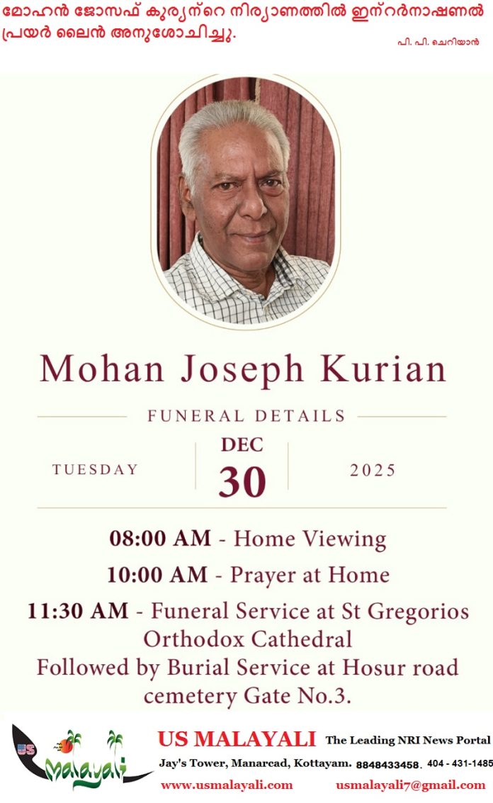 ഡെട്രോയിറ്റ് / ബാംഗ്ലൂർ: ഇന്റർനാഷണൽ പ്രയർ ലൈൻ (IPL) സജീവ പ്രവർത്തകനും എല്ലാവർക്കും പ്രിയങ്കരനുമായ ബാംഗ്ലൂർ നിവാസി മോഹൻ ജോസഫ് കുര്യൻ (72) അന്തരിച്ചു. ഡിസംബർ 27 ശനിയാഴ്ച ബാംഗ്ലൂരിൽ വെച്ചായിരുന്നു അന്ത്യം.