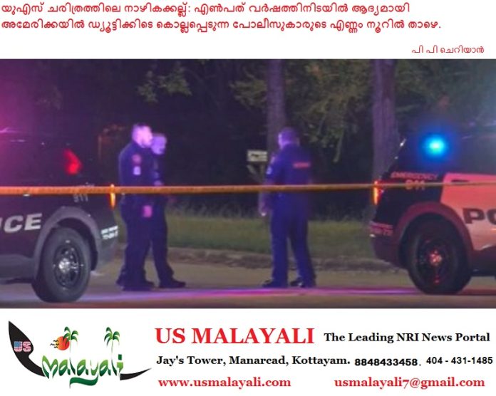 ഹൂസ്റ്റൺ: 1940-കൾക്ക് ശേഷം ആദ്യമായി അമേരിക്കയിൽ ഡ്യൂട്ടിക്കിടെ കൊല്ലപ്പെടുന്ന പോലീസ് ഉദ്യോഗസ്ഥരുടെ എണ്ണം നൂറിൽ താഴെയാകുന്നു. ക്രമസമാധാന പാലന രംഗത്ത് സുരക്ഷ വർദ്ധിപ്പിക്കുന്നതിൽ രാജ്യം കൈവരിച്ച ചരിത്രപരമായ നേട്ടമാണിതെന്ന് റിപ്പോർട്ടുകൾ സൂചിപ്പിക്കുന്നു.