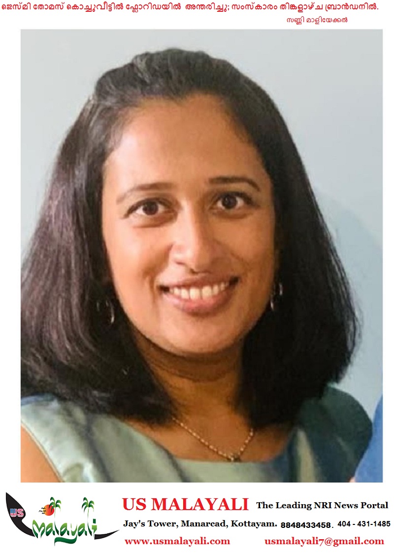 ഫ്ലോറിഡ: മലയാളി അസോസിയേഷൻ ഓഫ് സെൻട്രൽ ഫ്ലോറിഡ (MACF) അംഗം ജെസ്മി തോമസ് കൊച്ചുവീട്ടിൽ (39) അന്തരിച്ചു. പരേതയുടെ വിയോഗത്തിൽ മലയാളി അസോസിയേഷൻ ഓഫ് സെൻട്രൽ ഫ്ലോറിഡ അനുശോചനം രേഖപ്പെടുത്തി.