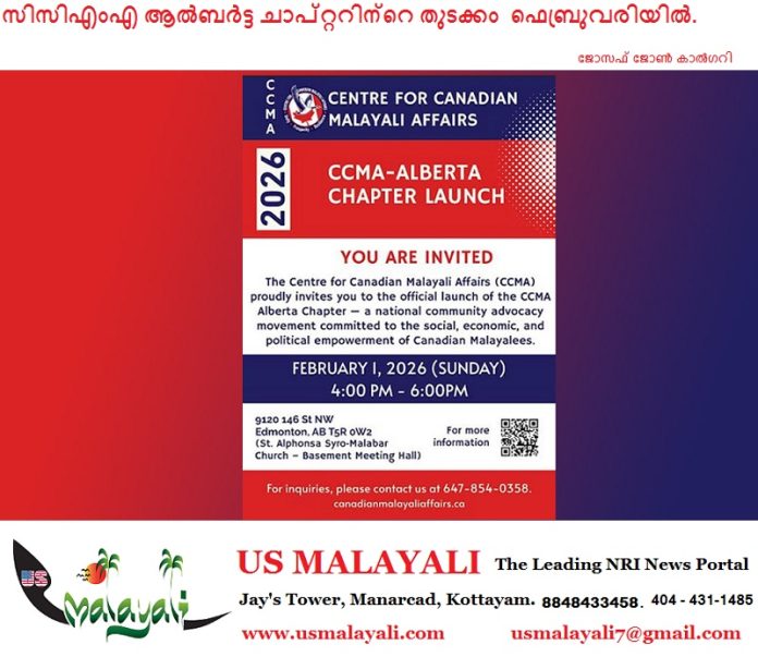 എഡ്മിന്റൻ : സെന്റർ ഫോർ കനേഡിയൻ മലയാളീസ് (സിസിഎംഎ) ആൽബർട്ട ചാപ്റ്ററിന് തുടക്കമാകുന്നു. ഫെബ്രുവരി ഒന്ന് ഞായറാഴ്ച വൈകിട്ട് നാലിന് എഡ്മിന്റൻ സെന്റ് അൽഫോൻസ സിറോ മലബാർ ചർച്ച് മീറ്റിങ് ഹാളിലാണ് പരിപാടി. മലയാളി സമൂഹത്തിലെ നേതൃനിരയിൽ സജീവമായവർക്കും പ്രഫഷനൽ, ബിസിനസ് രംഗങ്ങളിലുമുള്ളവർക്കും നവകുടിയേറ്റക്കാർക്കും വിദ്യാർഥികൾക്കുമെല്ലാം പങ്കെടുക്കാം.