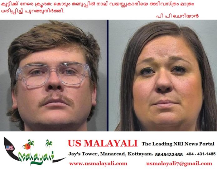 കാൻസസ്: അമേരിക്കയിലെ കാൻസസിൽ നാല് വയസ്സുകാരിയായ പെൺകുട്ടിയോട് പിതാവും കാമുകിയും കാട്ടിയ ക്രൂരത പുറംലോകത്തെ ഞെട്ടിക്കുന്നു. അബദ്ധത്തിൽ മൂത്രമൊഴിച്ചുവെന്ന കാരണത്താൽ മഞ്ഞുവീഴ്ചയുള്ള കൊടും തണുപ്പിൽ അടിവസ്ത്രം മാത്രം ധരിപ്പിച്ച് കുട്ടിയെ വീടിന് പുറത്തുനിർത്തിയതായാണ് പരാതി.
