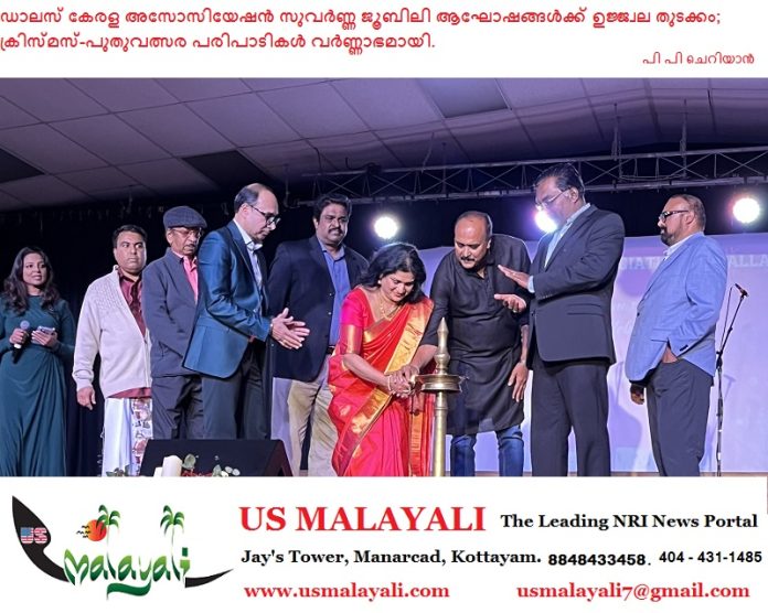 ഡാലസ്: കേരള അസോസിയേഷൻ ഓഫ് ഡാലസിന്റെ അൻപതാം വാർഷികാഘോഷങ്ങൾക്കും ക്രിസ്മസ്-പുതുവത്സര പരിപാടികൾക്കും ജനുവരി 10-ന് ഗാർലൻഡിലെ എം.ജി.എം ഓഡിറ്റോറിയത്തിൽ വർണ്ണാഭമായ തുടക്കം. ‘സുവർണ്ണ ജൂബിലി’ വർഷത്തിലേക്ക് പ്രവേശിക്കുന്ന അസോസിയേഷന്റെ ഈ വർഷത്തെ ആഘോഷങ്ങൾ പ്രമുഖ കായിക ഇതിഹാസങ്ങളായ പത്മശ്രീ ഷൈനി വിത്സനും വിത്സൻ ചെറിയാനും ചേർന്ന് ഭദ്രദീപം തെളിയിച്ച് ഉദ്ഘാടനം ചെയ്തു.