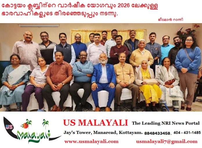 ഹൂസ്റ്റൺ: കേരളത്തിൻറെ അക്ഷര നഗരി എന്നറിയപ്പെടുന്ന കോട്ടയം പട്ടണമുൾപ്പെടുന്ന കോട്ടയം ജില്ലയിൽ നിന്ന് അമേരിക്കയിലെ ഹ്യൂസ്റ്റൺ പട്ടണത്തിലും സമീപ പ്രദേശത്തും താമസിക്കുന്നവരുടെ സംഘടനായ കോട്ടയം ക്ലബ്ബിൻറെ 2026 ലെക്കുള്ള ഭാരവാഹികളുടെ തിരഞ്ഞെടുപ്പും പോയ വർഷത്തെ വാർഷീക റിപ്പോർട്ടും കണക്കും അവതരിപ്പിച്ചു.