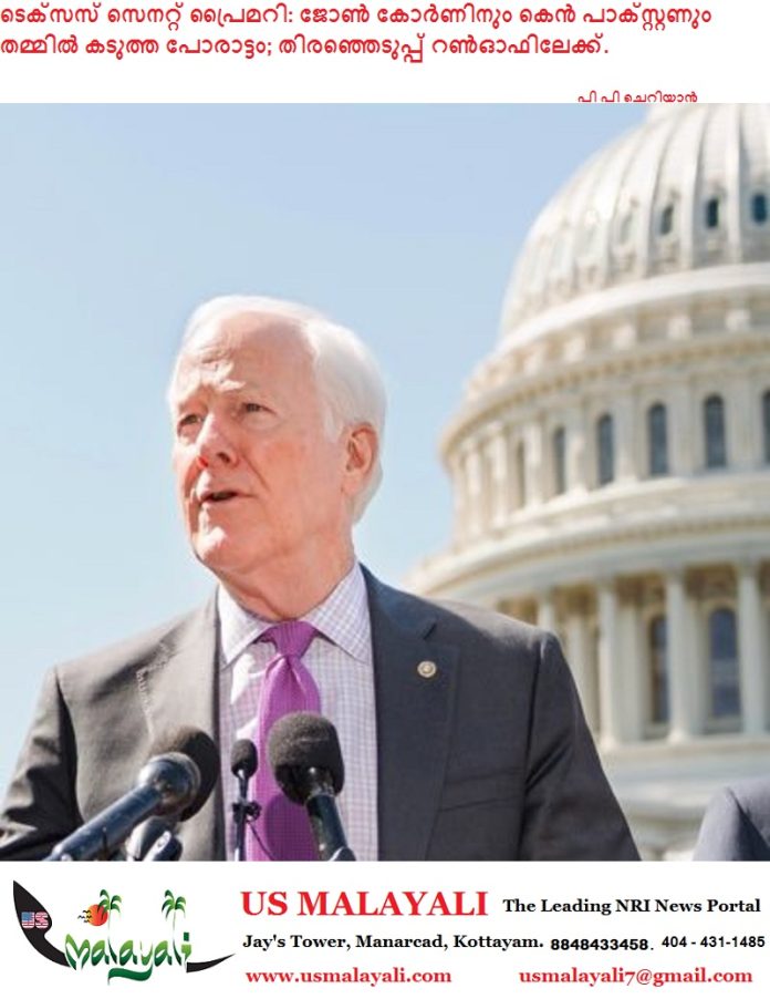 ഓസ്റ്റിൻ: ടെക്സസിലെ റിപ്പബ്ലിക്കൻ പാർട്ടി സെനറ്റ് പ്രൈമറിയിൽ നിലവിലെ സെനറ്റർ ജോൺ കോർണിനും സ്റ്റേറ്റ് അറ്റോർണി ജനറൽ കെൻ പാക്സ്റ്റണും തമ്മിൽ ഇഞ്ചോടിഞ്ച് പോരാട്ടം. വോട്ടെണ്ണൽ പൂർത്തിയായപ്പോൾ ആർക്കും വ്യക്തമായ ഭൂരിപക്ഷം (50 ശതമാനത്തിന് മുകളിൽ) ലഭിക്കാത്തതിനെത്തുടർന്ന് മെയ് 26-ന് നടക്കുന്ന റൺഓഫ് തിരഞ്ഞെടുപ്പിൽ ഇരുവരും വീണ്ടും ഏറ്റുമുട്ടും.