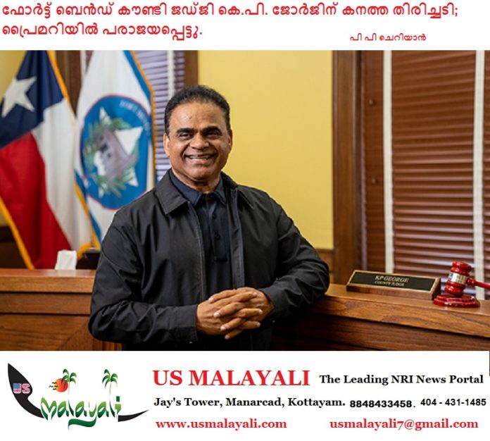 ഹൂസ്റ്റൺ :ഡെമോക്രാറ്റിക് പാർട്ടി വിട്ട് റിപ്പബ്ലിക്കൻ പാർട്ടിയിൽ ചേർന്ന ഫോർട്ട് ബെൻഡ് കൗണ്ടി ജഡ്ജി കെ.പി. ജോർജിന് ബി.ജെ.പി പ്രൈമറിയിൽ ദയനീയ പരാജയം. ചൊവ്വാഴ്ച നടന്ന തിരഞ്ഞെടുപ്പിൽ മത്സരിച്ച അഞ്ച് സ്ഥാനാർത്ഥികളിൽ വെറും 8.4% വോട്ടുകൾ മാത്രം നേടി അദ്ദേഹം അവസാന സ്ഥാനത്തായി.