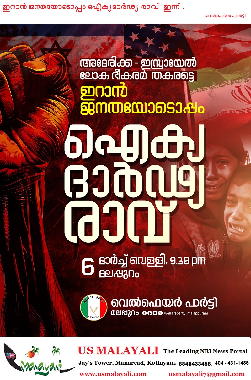 മലപ്പുറം: അമേരിക്ക-ഇസ്രായേൽ ലോകഭീകരർ തകരട്ടെ; ഇറാൻ ജനതയോടൊപ്പം എന്ന ശീർഷകത്തിൽ വെൽഫെയർ പാർട്ടി മലപ്പുറം ജില്ലാ കമ്മിറ്റിയുടെ ആഭിമുഖ്യത്തിൽ ഇറാൻ ഐക്യദാർഢ്യ രാവ് ഇന്ന് (വെള്ളി) രാത്രി 930ന് മലപ്പുറത്ത്.