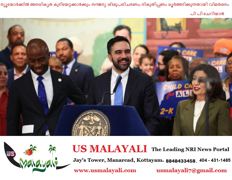 ന്യൂയോർക്ക് ഗവർണർ കാത്തി ഹോക്കലും മേയർ സോഹ്റാൻ മംദാനിയും ചേർന്ന് നഗരത്തിലെ രണ്ട് വയസ്സുള്ള കുട്ടികൾക്കായി സൗജന്യ ശിശുപരിചരണ പദ്ധതി പ്രഖ്യാപിച്ചു. വരുമാനമോ, താമസിക്കുന്ന സ്ഥലമോ, ഇമിഗ്രേഷൻ പദവിയോ നോക്കാതെ എല്ലാവർക്കും ഈ സേവനം ലഭ്യമാക്കുമെന്നാണ് പ്രഖ്യാപനം.
