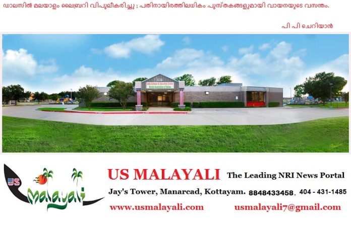 ഡാലസ്: പ്രവാസലോകത്തെ അക്ഷരസ്നേഹികൾക്കായി കേരള അസോസിയേഷൻ ഓഫ് ഡാലസ് മലയാളം ലൈബ്രറി വായനക്കാർക്കായി വിപുലീകരിച്ചു. മലയാളത്തിന്റെ മണമുള്ള പുസ്തകങ്ങളുമായി വായനയുടെ വസന്തം ഇനി ഡാലസിലും ആസ്വദിക്കാം.