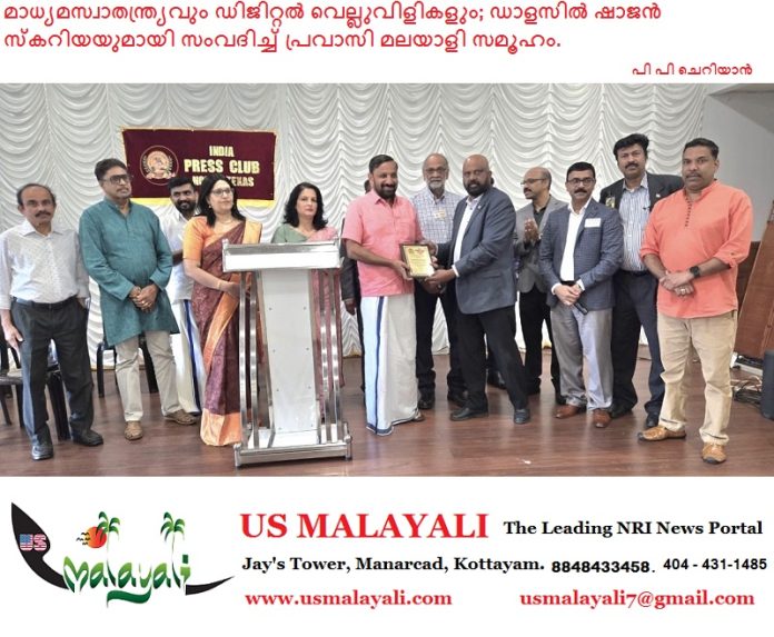 ഡാളസ്: നോർത്ത് ടെക്സസിലെ പ്രവാസി മാധ്യമപ്രവർത്തകരുടെ കൂട്ടായ്മയായ ഇന്ത്യ പ്രസ് ക്ലബ് ഓഫ് നോർത്ത് ടെക്സസ് സംഘടിപ്പിച്ച “ആഘോഷിക്കാം, ഒത്തുചേരാം” എന്ന പ്രത്യേക പരിപാടി ജനപങ്കാളിത്തം കൊണ്ട് ശ്രദ്ധേയമായി. ഗാർലൻഡിലെ കെ.ഇ.എ ഇവന്റ് സെന്ററിൽ നടന്ന ചടങ്ങിൽ പ്രമുഖ മാധ്യമപ്രവർത്തകനും ‘മറുനാടൻ മലയാളി’യുടെ സ്ഥാപക എഡിറ്ററുമായ ഷാജൻ സ്കറിയ മുഖ്യാതിഥിയായി പങ്കെടുത്തു. സോഷ്യൽ മീഡിയ ദിനത്തോടനുബന്ധിച്ച് സംഘടിപ്പിച്ച ഈ പരിപാടിയിൽ മാധ്യമരംഗത്തെ പുതിയ പ്രവണതകളെക്കുറിച്ചും വെല്ലുവിളികളെക്കുറിച്ചും സജീവമായ ചർച്ചകൾ നടന്നു.