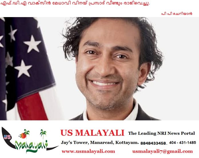 വാഷിംഗ്ടൺ ഡി.സി: അമേരിക്കൻ ഫുഡ് ആൻഡ് ഡ്രഗ് അഡ്മിനിസ്ട്രേഷന്റെ വാക്സിൻ വിഭാഗം മേധാവി വിനയ് പ്രസാദ് സ്ഥാനം ഒഴിഞ്ഞു. ഒരു വർഷത്തിനിടെ ഇത് രണ്ടാം തവണയാണ് അദ്ദേഹം രാജിവെക്കുന്നത്. ഫാർമസ്യൂട്ടിക്കൽ കമ്പനികളുമായുള്ള തർക്കങ്ങളും നിയന്ത്രണങ്ങൾ കർശനമാക്കിയതുമായി ബന്ധപ്പെട്ട വിവാദങ്ങളുമാണ് രാജിയിലേക്ക് നയിച്ചത്.