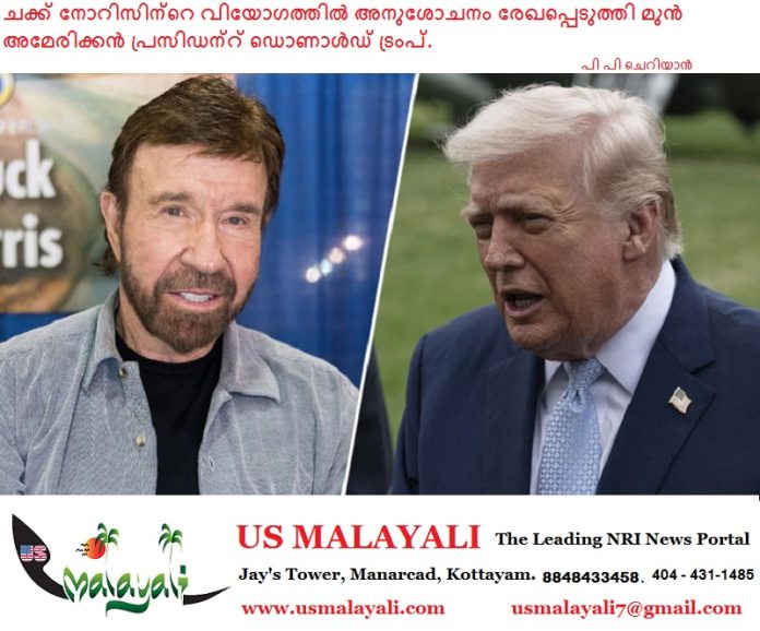 ഹവായ് :ആക്ഷൻ സിനിമാ ലോകത്തെ ഇതിഹാസ താരം ചക്ക് നോറിസിന്റെ വിയോഗത്തിൽ അനുശോചനം രേഖപ്പെടുത്തി അമേരിക്കൻ പ്രസിഡന്റ് ഡൊണാൾഡ് ട്രംപ്. ഹവായിലെ ആശുപത്രിയിൽ ചികിത്സയിലിരിക്കെ വ്യാഴാഴ്ചയാണ് 86 വയസ്സുകാരനായ ചക്ക് നോറിസ് അന്തരിച്ചത്.