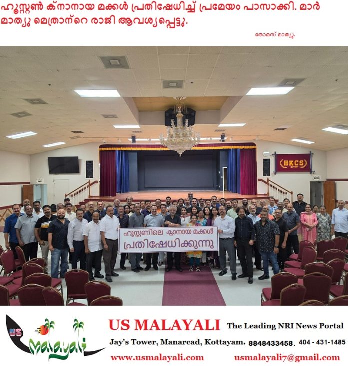ഹൂസ്റ്റൺ: ഹൂസ്റ്റണിലെ ക്നാനായ കമ്മ്യൂണിറ്റി സെൻട്രലിൽ ഒത്തുകൂടിയ കനാനായ മക്കൾ നിലവിലെ കോടതി വിധി തള്ളിക്കളയുകയും കോട്ടയം രൂപതാ മെത്രാന്റെ അനാസ്ഥ മൂലം ഈ വിധി ചോദിച്ചു വാങ്ങിയതാണ് എന്ന ആശയത്തോട് കൂടുതൽ പേരും സംസാരിക്കുകയും ഇനിയും കൂടുതൽ പണം മുടക്കി അപ്പീലിന് പോകുന്നതിൽ യാതൊരു കഴമ്പും ഇല്ല എന്നും അഭിപ്രായപ്പെട്ടു.