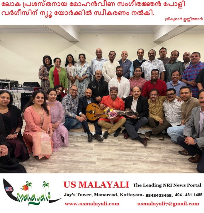 ന്യൂ യോർക്ക് : മോഹൻവീണ എന്ന അപൂർവ സംഗീതോപകരണ വാദനത്തിലൂടെ ലോക പ്രശസ്തനായ സംഗീതജ്ഞൻ പോളി വർഗീസിന് ന്യൂ യോർക്കിൽ സ്വീകരണം നൽകി. ലോക സഞ്ചാരത്തിന്റെ ഭാഗമായി ഒട്ടേറെ.രാജ്യങ്ങളിൽ സംഗീത പരിപാടികൾ അവതരിപ്പിക്കുന്ന തൃശൂർ സ്വദേശി പോളി വർഗീസ്, അമേരിക്കൻ പര്യടനത്തിന് ഇടയിൽ ന്യൂ യോർക്കിൽ എത്തിച്ചേർന്നപ്പോൾ ആണ് മോഹനവീണയിൽ സംഗീത സദസ് നടത്തിയത്. ന്യൂ യോർക്കിലെ കലാ സാംസ്കാരിക രംഗത്ത് സജീവ സാനിദ്യമായ രവി വെലികെട്ടിലിന്റെ (രവി നായർ ) നേതൃത്വത്തിൽ ആയിരുന്നു സ്വീകരണ പരിപാടി നടത്തിയത്.