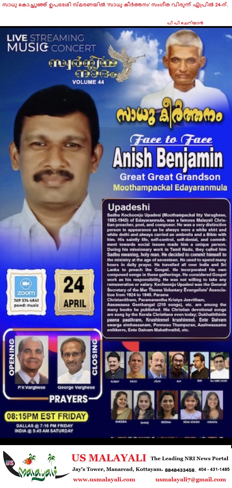 ഡാളസ് : പ്രശസ്ത ക്രൈസ്തവ പ്രസംഗകനും ഗാനരചയിതാവുമായിരുന്ന സാധു കൊച്ചുഞ്ഞ് ഉപദേശിയുടെ സ്മരണാർത്ഥം “സ്വർഗീയ നാദം” സംഘടിപ്പിക്കുന്ന ‘സാധു കീർത്തനം’ ലൈവ് സ്ട്രീമിംഗ് മ്യൂസിക് കൺസേർട്ട് ഏപ്രിൽ 24 വെള്ളിയാഴ്ച നടക്കും. സാധു കൊച്ചുഞ്ഞ് ഉപദേശിയുടെ (മൂത്തമ്പാക്കൽ ഇടയാറന്മുള) കൊച്ചുമകന്റെ മകനായ അനീഷ് ബെഞ്ചമിൻ ആണ് ഈ ‘ഫേസ് ടു ഫേസ്’ പരിപാടിയിൽ മുഖ്യാതിഥിയായി എത്തുന്നത്.