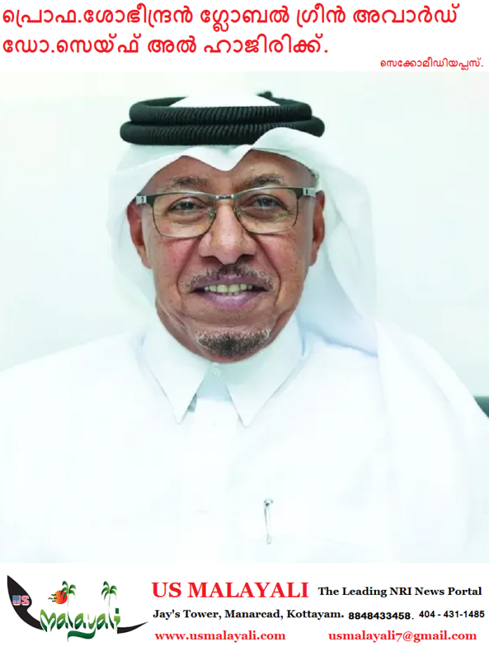 ദോഹ: പ്രകൃതിയുടെ ഉപാസകനും പരിസ്ഥിതി ദൗത്യങ്ങളുടെ മുന്നിര നായകനുമായിരുന്ന പ്രൊഫ.ശോഭീന്ദ്രന് മാഷിന്റെ ആദര സ്മരണകളുമായി, മൈന്റ്ട്യൂണ് ഇക്കോവേവ്സ് ഗ്ലോബല് എന്.ജി.ഒ സൊസൈറ്റി ഏര്പ്പെടുത്തുന്ന പ്രഥമ ‘പ്രൊഫ.ശോഭീന്ദ്രന് ഗ്ലോബല് ഗ്രീന് അവാര്ഡ്’ ഖത്തറിന്റെ പരിസ്ഥിതി മുഖമായ ഡോ.സെയ്ഫ് അല് ഹാജിരിയ്ക്ക്.
