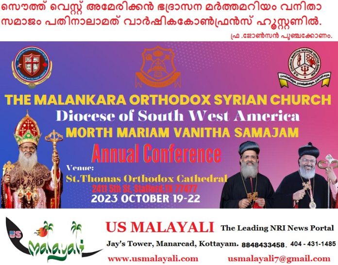 ഹൂസ്റ്റൺ : സൌത്ത് വെസ്റ്റ് അമേരിക്കന് ഭദ്രാസന മര്ത്തമറിയം വനിതാ സമാജം പതിനാലാമത് വാര്ഷിക കോണ്ഫ്രന്സ് 2023 ഒക്ടോബര് 19, 20, 21, 22 തീയതികളില് ഹൂസ്റ്റൺ സെന്റ്തോമസ് ഓര്ത്തഡോക്സ് കത്തീണ്ട്രലില് നടക്കും. ‘കുരിശൂ