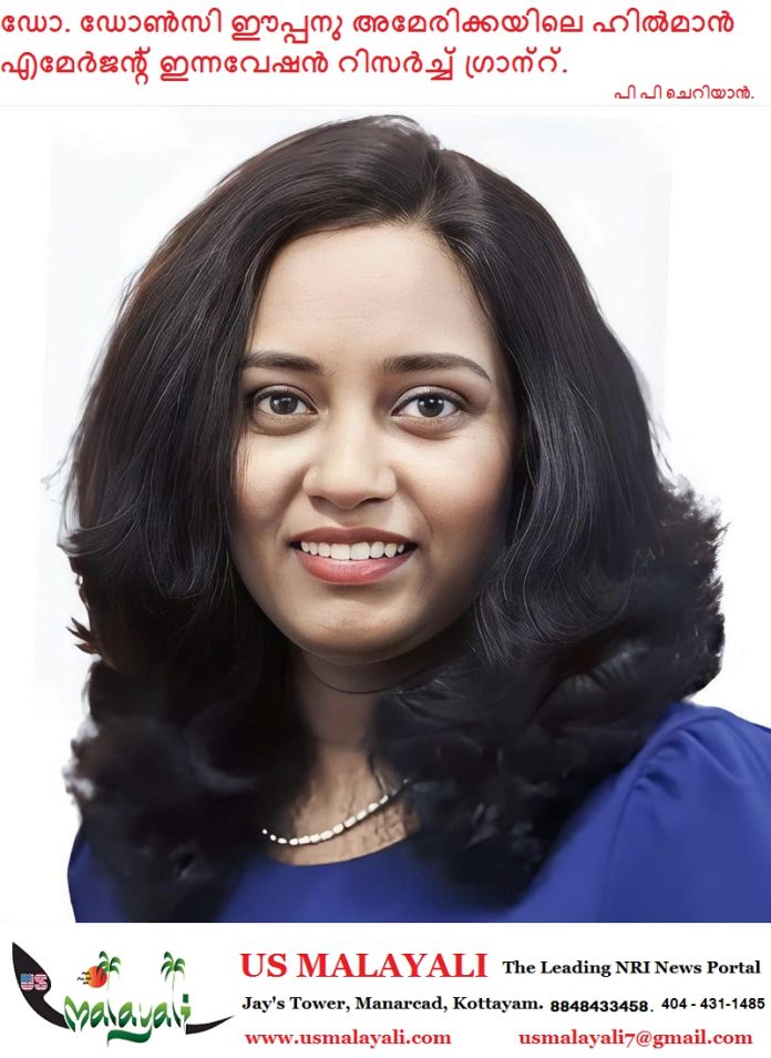 ടെക്സാസ് : യു എസി ലെ പ്രശസ്തമായ ഹില്മാന് എമേര്ജന്റ് ഇന്നവേഷന് റിസര്ച്ച് ഗ്രാന്റിന് ഡോ. ഡോണ്സി ഈപ്പന് അർഹയായി .