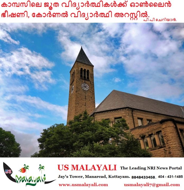 ന്യൂയോർക്ക് : ന്യൂയോർക്കിലെ പിറ്റ്സ്ഫോർഡിൽ നിന്നുള്ള കോർണൽ യൂണിവേഴ്സിറ്റിയിലെ ജൂനിയറായ പാട്രിക് ഡായ്, 21 അന്തർസംസ്ഥാന ആശയവിനിമയങ്ങൾ ഉപയോഗിച്ച് മറ്റൊരാളെ കൊല്ലുകയോ പരിക്കേൽപ്പിക്കുകയോ ചെയ്യുമെന്ന് ഭീഷണിപ്പെടുത്തിയതിന് ഫെഡറൽ ക്രിമിനൽ പരാതിയിൽ ഇന്ന് അറസ്റ്റിലായി. യുണൈറ്റഡ് സ്റ്റേറ്റ്സ് അറ്റോർണി കാർല ബി ഫ്രീഡ്മാൻ ആണ് പ്രഖ്യാപനം നടത്തിയത്.